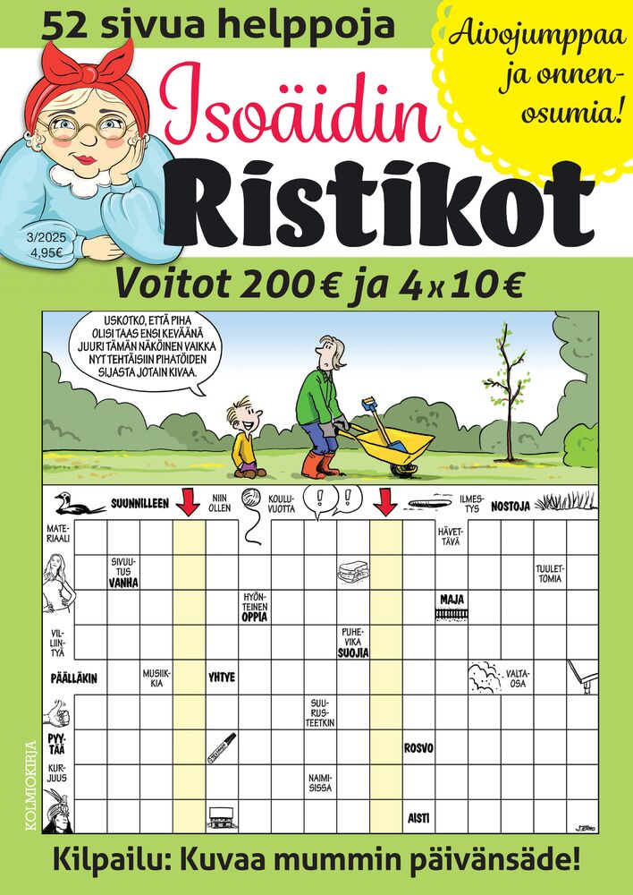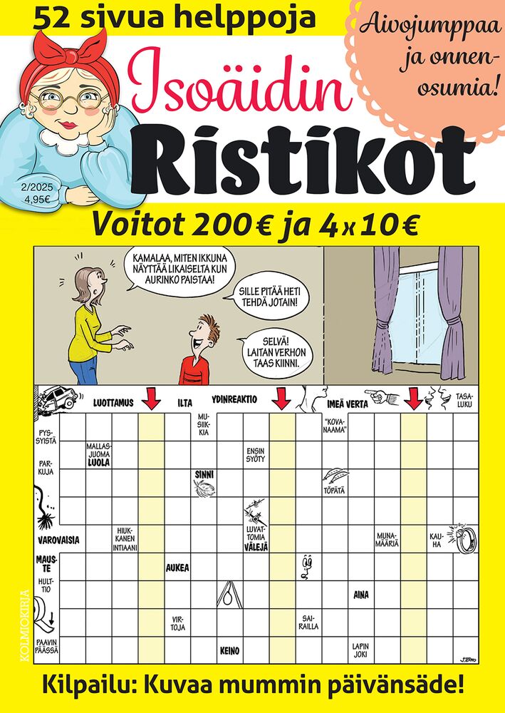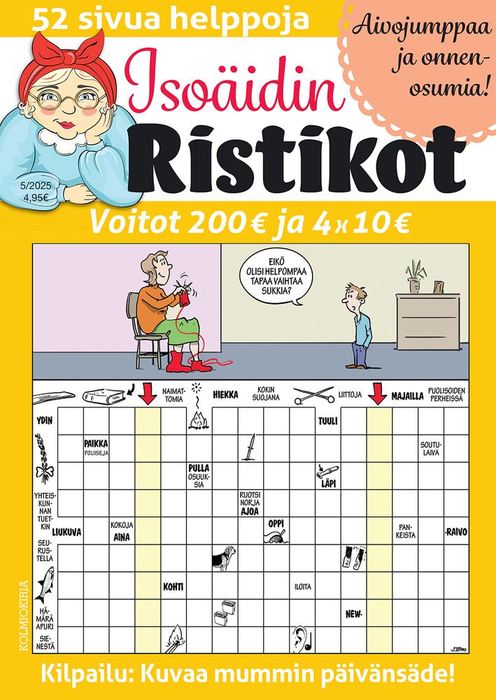 Isoäidin Ristikot on uusi suosikkilehti kaikille, jotka rakastavat lempeää huumoria, selkeitä ristikoita ja yhteisöllistä tekemistä. Tämä lämminhenkinen ristikkolehti tarjoaa vain Suomen parhaiden laatijoiden helppoja ja hauskoja kuvaristikoita, joiden vihjeet ja sanasto on suunniteltu olemaan helposti ymmärrettäviä. Lehti ei ole sidottu liiaksi nykyaikaan, vaan sen sisältö puhuttelee kaikenikäisiä ratkojia.