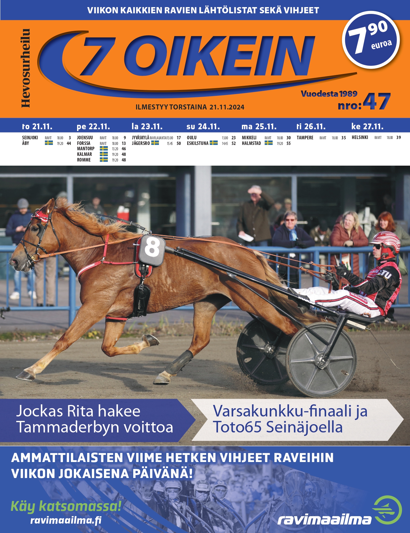 Tilaa 7 oikein ja saat kaikki ravien käsiohjelmatiedot ja vihjeet kätevästi yhdestä lehdestä. 7 oikein on ainutlaatuinen pelilehti, joka tarjoaa kattavasti ajankohtaista ja hyödyllistä sisältöä kaikille raviurheilun ja veikkaamisen ystäville. Lehti sisältää kaikkien Suomen totoravien käsiohjelmat lähtökohtaisine vihjeineen, asiantuntevat tallikommentit sekä valmiit vihjesysteemit kaikkiin T-peleihin, Duoon ja Troikkiin. Tämä tekee 7 oikein -lehdestä korvaamattoman apuvälineen niin kokeneelle pelaajalle kuin aloittelevallekin harrastajalle.
