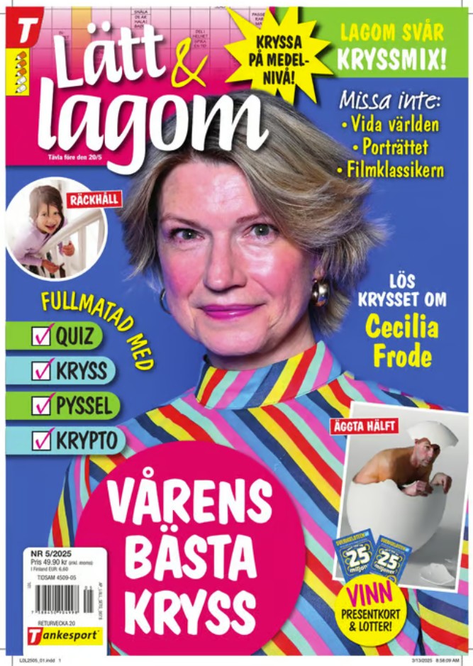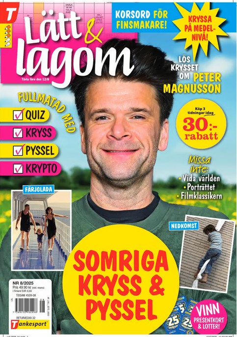 Lätt & Lagom on ruotsinkielinen ristikkolehti sinulle, joka arvostat helppojen ja keskivaikeiden tehtävien tarjoamaa rentoutumista, iloa ja sopivasti haastavaa aivojumppaa. Lehti on suunniteltu kaikille sanapähkinöiden ystäville – olitpa sitten aloittelija tai kokenut ratkoja, löydät tästä lehdestä itsellesi mieluisaa tekemistä. Lätt & Lagom tarjoaa klassisia ristikoita ja uusia tehtävämuotoja tasapainoisessa ja viihdyttävässä paketissa, joka ilmestyy 12 kertaa vuodessa.